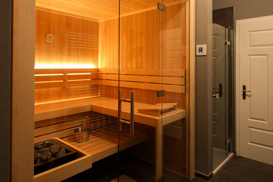 - Optional: moderne, flächige Saunaplatten für klares Design